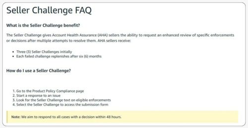 Seller Challenge is an added review path that sits on top of Amazon’s existing appeal process. It is available only to sellers enrolled in the Account Health Assurance (AHA) program, which protects qualifying accounts from sudden deactivation as long as they engage promptly to resolve issues.